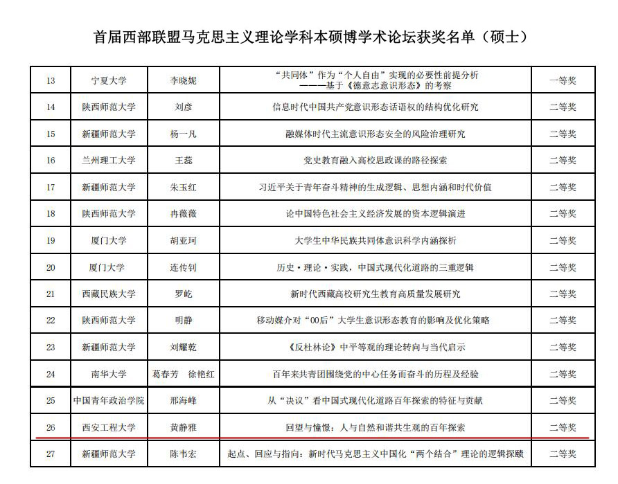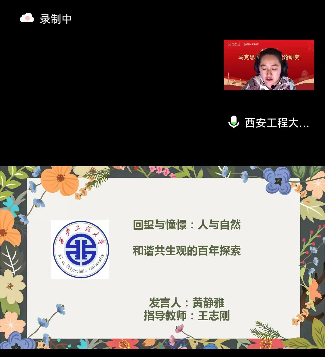 馬克思主義學(xué)院2020級碩士研究生黃靜雅受邀參加會議并發(fā)言。她向大會提交的學(xué)術(shù)論文《回望與憧憬:人與自然和諧共生觀的百年探索》,經(jīng)專家評審,從眾多投稿作品中脫穎而出,榮獲二等獎并受邀在論壇做主題發(fā)言。經(jīng)組委會評審,馬克思主義學(xué)院王志剛教授榮獲本屆論壇“優(yōu)秀指導(dǎo)教師”稱號。