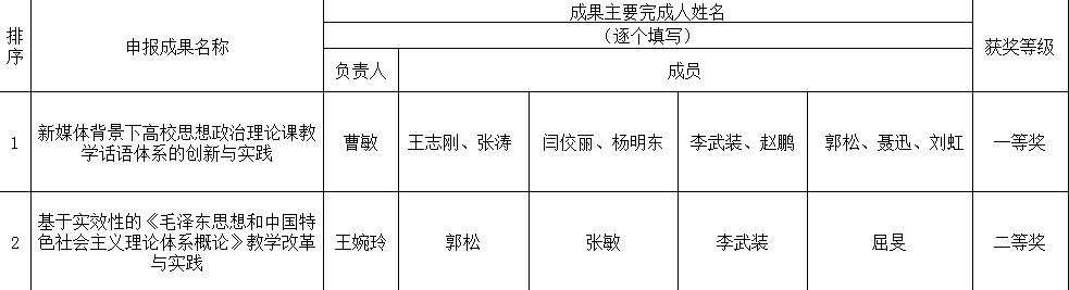 在2017年校級教學(xué)成果獎申報(bào)評選中,曹敏教授為第一完成人申報(bào)的“新媒體背景下高校思想政治理論課教學(xué)話語體系的創(chuàng)新與實(shí)踐”成果獲得一等獎;王婉玲教授主持完成的“基于實(shí)效性的《毛澤東思想和中國特色社會主義理論體系概論》教學(xué)改革與實(shí)踐”成果獲二等獎。