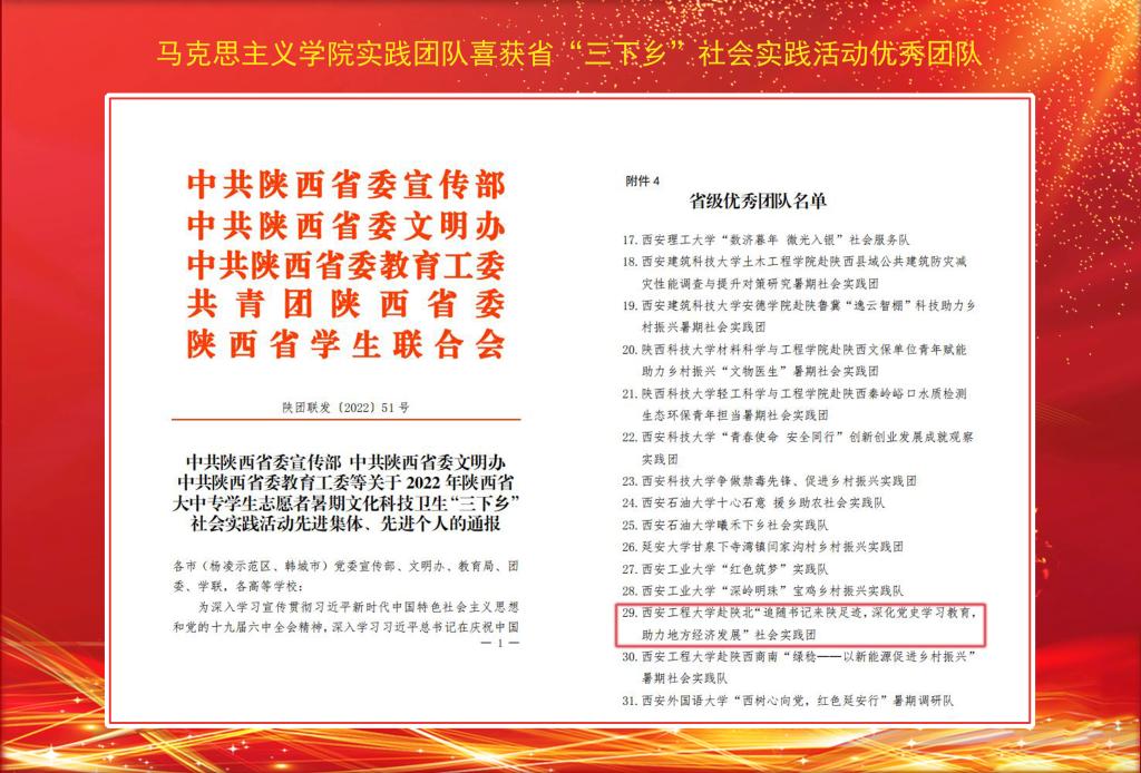 近日,中共陜西省委宣傳部、中共陜西省委高教工委、陜西省文明辦、陜西省教育廳、共青團(tuán)陜西省委及陜西省學(xué)生聯(lián)合會(huì)聯(lián)合對(duì)2022年陜西省大中專學(xué)生志愿者暑期“三下鄉(xiāng)”社會(huì)實(shí)踐活動(dòng)進(jìn)行了表彰,馬克思主義學(xué)院“赴陜北“追隨書記來陜足跡,深化黨史學(xué)習(xí)教育, 助力地方經(jīng)濟(jì)發(fā)展”社會(huì)實(shí)踐團(tuán)”榮獲“省級(jí)優(yōu)秀團(tuán)隊(duì)”榮譽(yù)稱號(hào)。(撰稿:孫建榮 審核:楊永革)