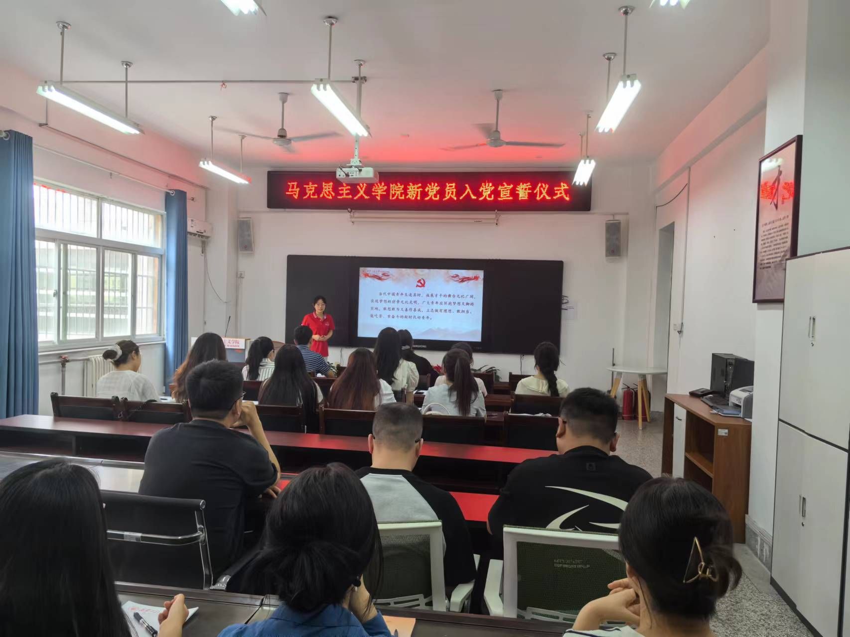 為迎接中國共產(chǎn)黨成立103周年,深入學(xué)習(xí)貫徹習(xí)近平新時(shí)代中國特色社會(huì)主義思想,引導(dǎo)新黨員進(jìn)一步堅(jiān)定理想信念,牢記黨的宗旨,7月1日下午,馬克思主義學(xué)院黨委舉行新黨員入黨宣誓儀式,學(xué)院黨委書記楊永革、學(xué)工辦主任孫建榮、各學(xué)生黨支部委員和19名新發(fā)展黨員參加了儀式。