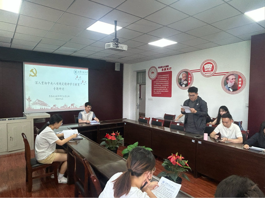 6月16日,馬克思主義學(xué)院思想政治教育研究生黨支部在人文樓203會(huì)議室召開支部大會(huì),通過支部書記講專題黨課、警示教育會(huì)與專題研討會(huì)等形式,從嚴(yán)從實(shí)推進(jìn)深入貫徹中央八項(xiàng)規(guī)定精神學(xué)習(xí)教育。會(huì)議由支部書記梁育主持。