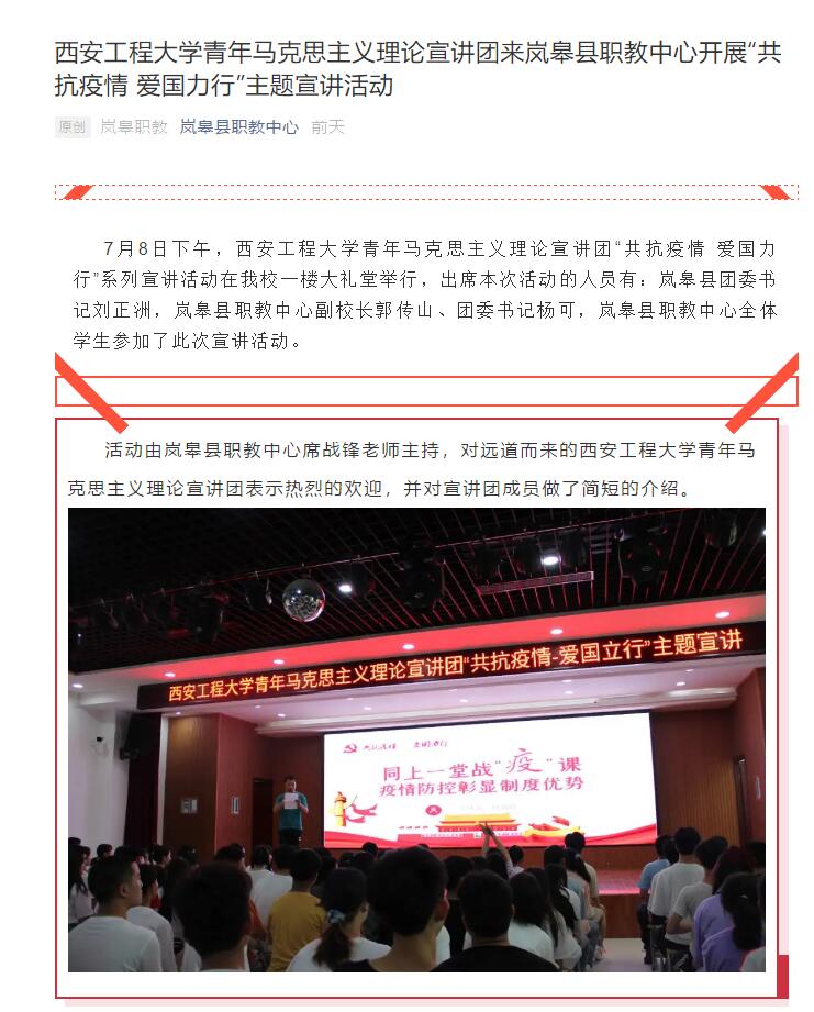 在當(dāng)前全民疫情防控的阻擊戰(zhàn)中,中國特色社會主義制度的優(yōu)越性再次得以彰顯,經(jīng)受了實踐的檢驗,廣大青年紛紛響應(yīng)黨的號召,踴躍投身于疫情防控戰(zhàn)中。西安工程大學(xué)馬克思主義學(xué)院“青年馬克思主義理論宣講團”立足學(xué)科優(yōu)勢,主動擔(dān)當(dāng)作為,積極組織開展了“共抗疫情·愛國力行”系列主題宣講活動。