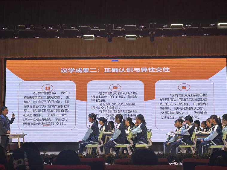 在課程觀摩環(huán)節(jié),師生們認(rèn)真聆聽了正高級教師呂亞鵬主講的《男生女生》和高級教師梁寅子講授的《歷久彌新的思想理念》。呂老師以熱身小游戲開啟課堂,采用議題式教學(xué),借助三封信件,引導(dǎo)學(xué)生深入探討異性差異、交往和情感,幫助學(xué)生理解性別差異與優(yōu)勢互補(bǔ),最后寄語學(xué)生正確看待異性交往,研究生們專注記錄呂老師的教學(xué)方法和互動技巧。梁老師用《孔子》《孟子》《論語》名言導(dǎo)入,以毛烏素治理為案例開展議題式教學(xué),拋出總議題,通過展示治理前后資料,組織學(xué)生討論生態(tài)環(huán)保、可持續(xù)發(fā)展等角度的問題。梁老師還與師生們開展了交流,闡釋優(yōu)秀傳統(tǒng)思想理念的價值,使研究生們認(rèn)識到議題式教學(xué)的重要性。