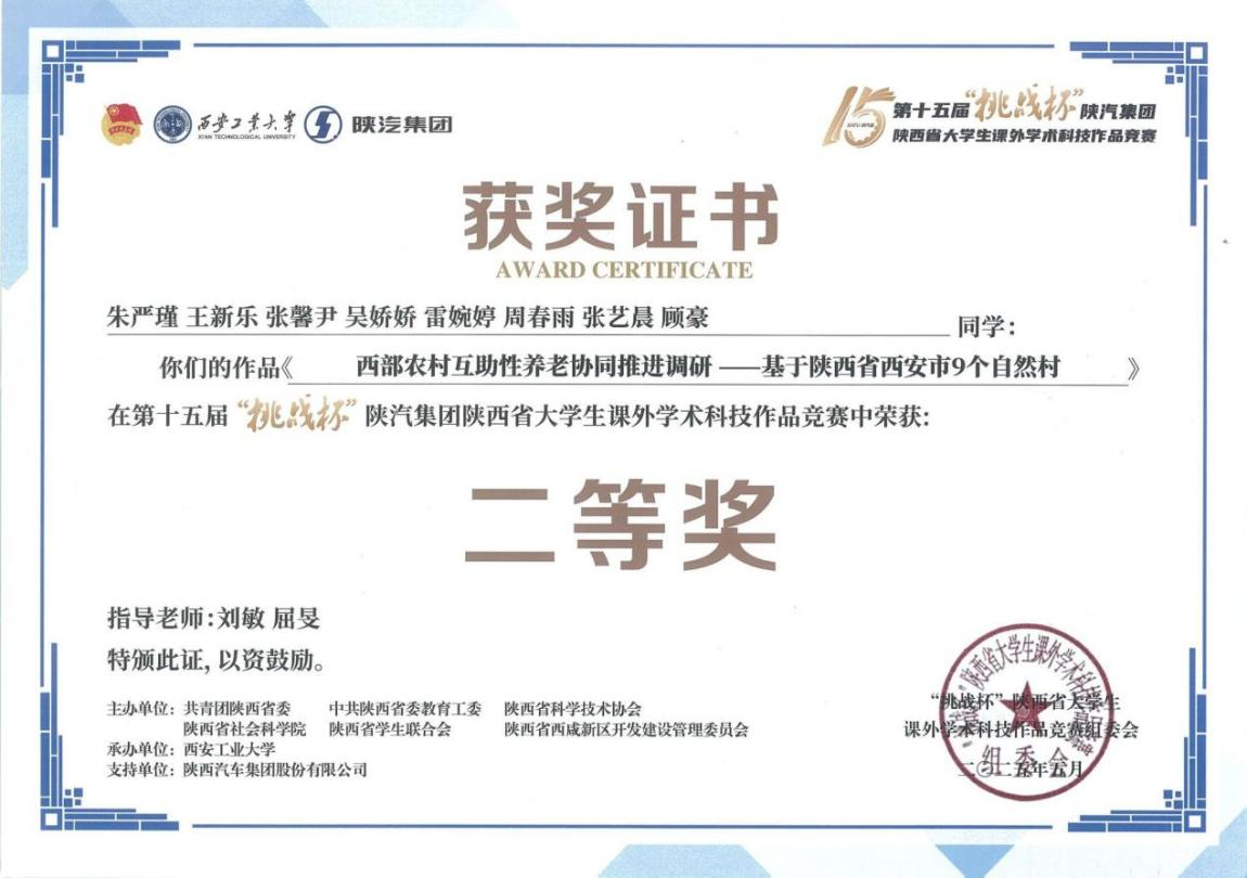 5月24日,劉敏副教授和屈旻副教授指導的研究生團隊項目《西部農(nóng)村互助性養(yǎng)老協(xié)同推進調(diào)研——基于陜西省西安市9個自然村》在第十五屆“挑戰(zhàn)杯”榮獲省級二等獎