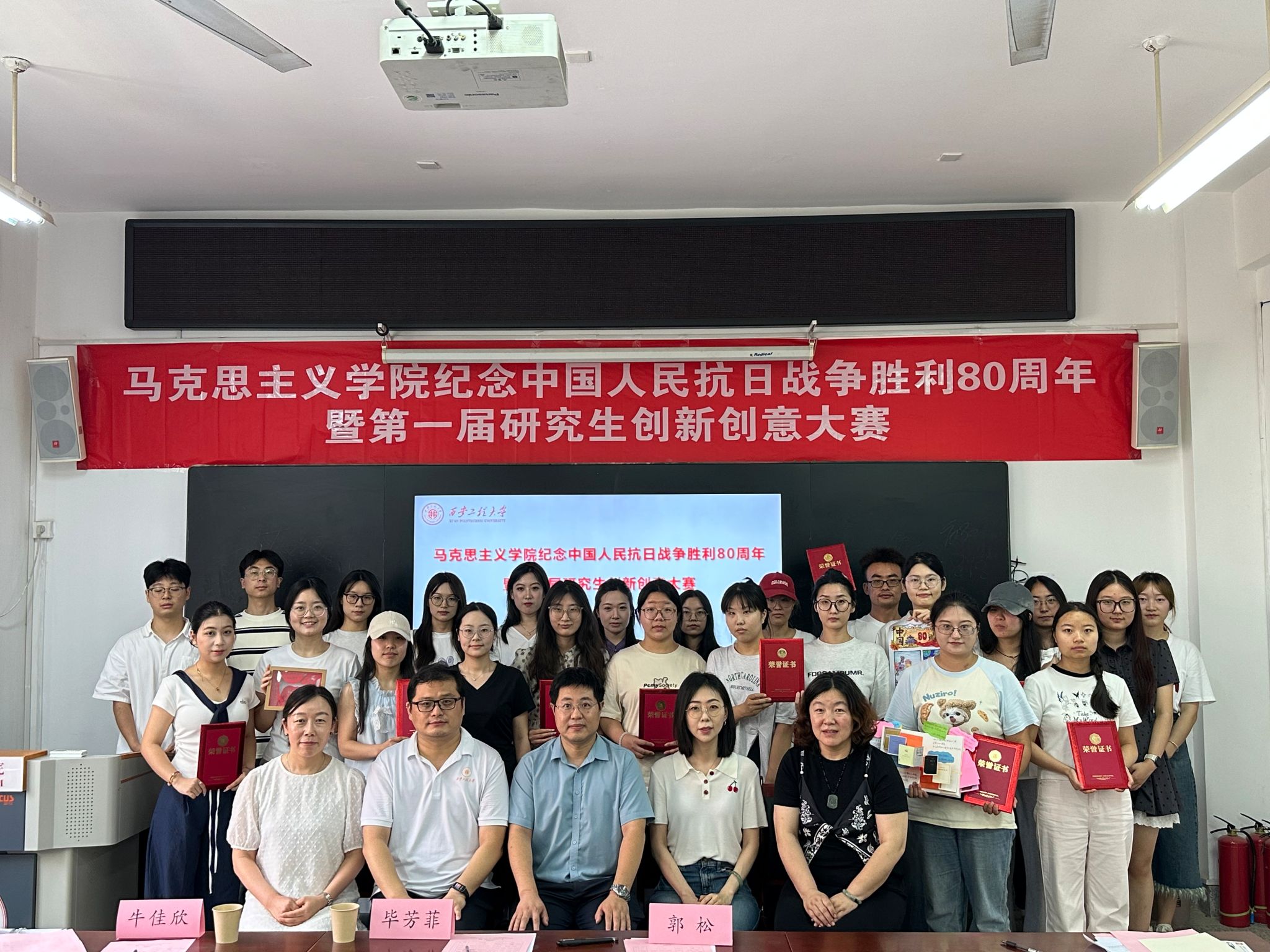 隨著頒獎環(huán)節(jié)的到來,榮耀時刻見證了奮斗者的高光瞬間。獲獎同學(xué)舉起證書,眼中閃爍著自豪與堅定的光芒,在熱烈的掌聲中默默積蓄著再次出發(fā)的力量。這場大賽沒有失敗者,因為每一份作品都傾注了對歷史的敬畏、對精神的堅守,每一次嘗試都是對創(chuàng)新的勇敢突破、對團結(jié)凝聚力的生動詮釋。在熱烈的掌聲中,馬克思主義學(xué)院紀(jì)念中國人民抗日戰(zhàn)爭勝利80周年暨第一屆研究生創(chuàng)新創(chuàng)意大賽圓滿落下帷幕。